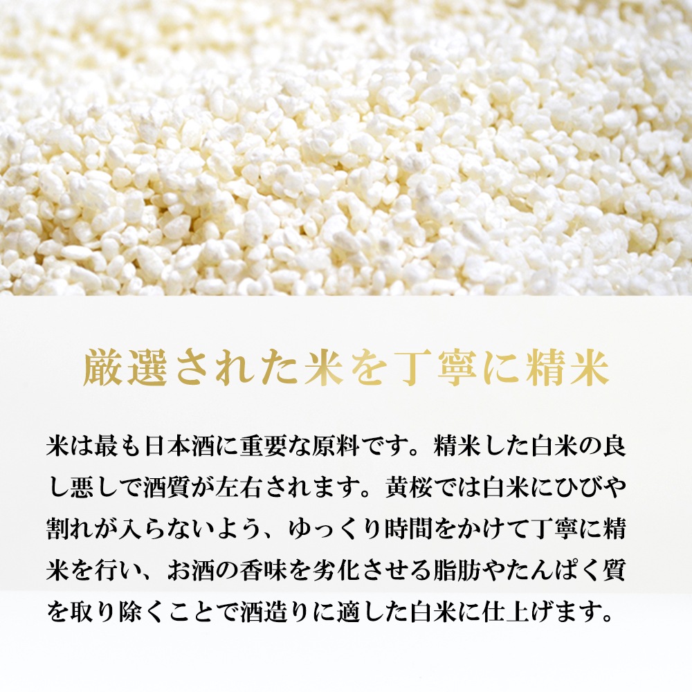 米は最も日本酒に重要な原料です。精米した白米の良し悪しで酒質が左右されます。黄桜では白米にひびや割れが入らないよう、 ゆっくり時間をかけて丁寧に精米を行い、お酒の香味を劣化させる脂肪やたんぱく質を取り除くことで酒造りに適した白米に仕上げます。