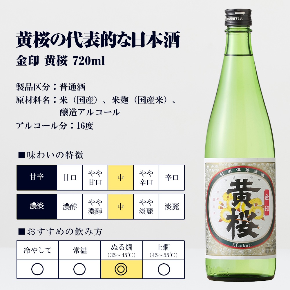 酒処京都伏見で伝統の酒造りを守り続け、本物の旨さを追求した黄桜の代表的な日本酒です。 やわらかく上品な甘さを感じさせる香り、調和のとれた飲み口のやわらかさ、ふくらみのある旨みが特長です。また、甘辛濃淡の調和のとれた味わいはどんな料理とも相性が良く、料理を選びません。普段の晩酌にお楽しみください。