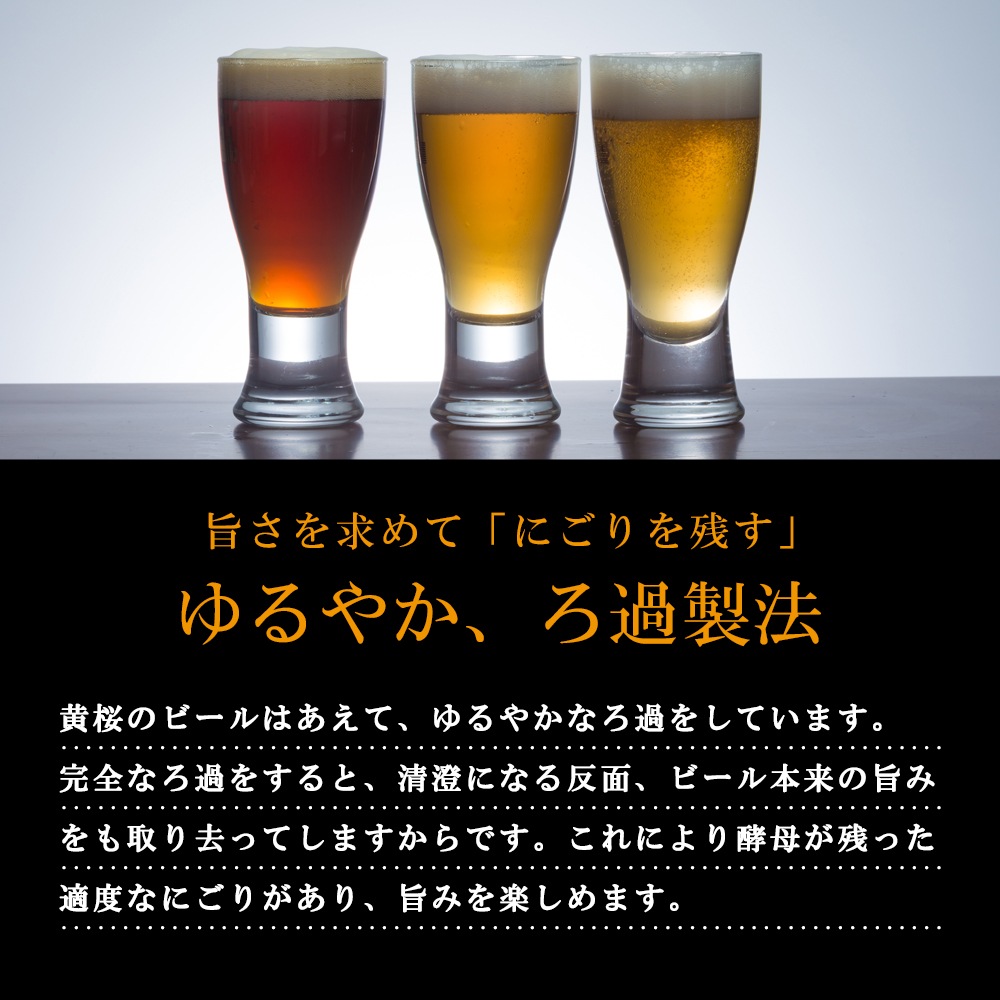 黄桜のビールはあえて、ゆるやかなろ過をしています。完全なろ過をすると、清澄になる反面、ビール本来の香りや旨みをも取り去ってしまうからです。これにより酵母が残った適度なにごりがあり、旨味を楽しめます。喉ごしではなく、舌で味わうビール。大手ビールとは一味違う、旨味のあるクラフトビールをお楽しみください。