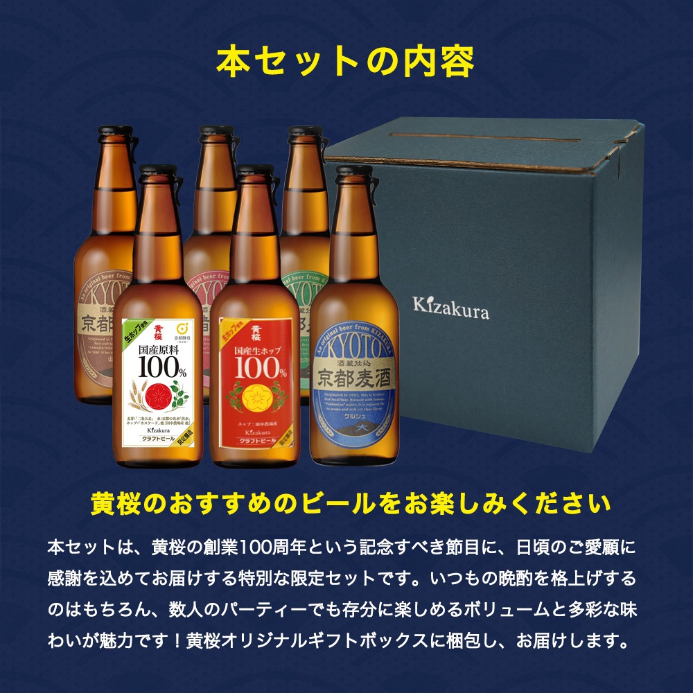 100年の節目に、皆様への感謝の気持ちを込めてお届けする、黄桜の歴史と技術の粋を集めた特別なビールセットです。 酒造りで培った伝統と革新の技術を注ぎ込み、個性豊かな6種類の味わいを厳選しました。限定醸造の希少なビールや、日本酒の技を応用した和のビールなど、当社の百年の歩みを感じさせる珠玉のラインナップです。