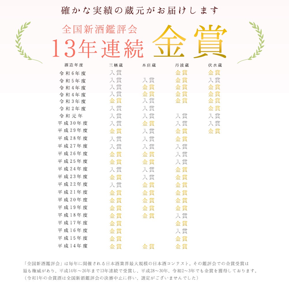 黄桜は昭和47年度から「全国新酒鑑評会」において「金賞」を受賞しております。「全国新酒鑑評会」は毎年春に開催される日本酒業界最大規模の日本酒コンテストです。その鑑評会での金賞受賞は最も権威あるものとして酒造業界では認められています。