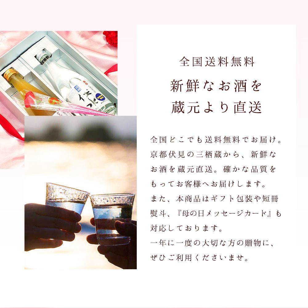 全国新酒鑑評会では13年連続など毎年のように金賞を受賞している蔵元が自信をもっておススメする、梅酒と日本酒のギフトセットです。 ギフト包装、熨斗、メッセージカードに対応しております。お酒が苦手な方でも楽しめる「とろり梅酒」はお年寄りから若い方、男女問わずにどなたでも飲みやすい梅酒です。フルーティーでリッチな梅と日本酒の風味が、リラックスした穏やかな気分を誘います。 花きざくらはアルコール度数がおさえめで、香り高くすっきりとした日本酒初心者におすすめのお酒です。大切なあの人へ、春の花の香りがギュッと詰まったお酒のセットで「感謝の気持ち」を伝えませんか。