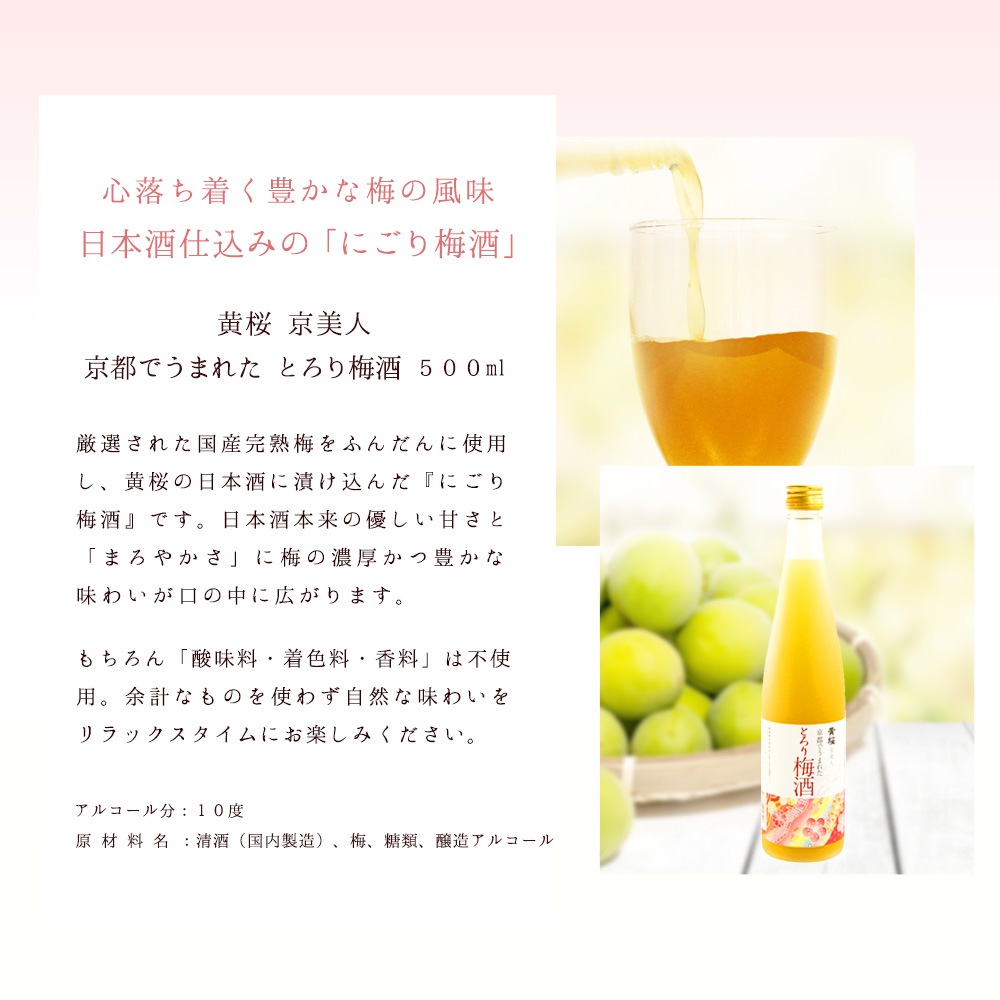 京都青谷産の梅をふんだんに使用し、酒どころ京都伏見「黄桜」の日本酒に漬け込んでいます。その漬け込んだ梅の実をピューレにして加えるなど、手間暇かけてつくったにごり梅酒です。日本酒本来のやさしい甘さとまろやかさ、とろりとリッチな完熟梅の豊かな味わいが特長です。